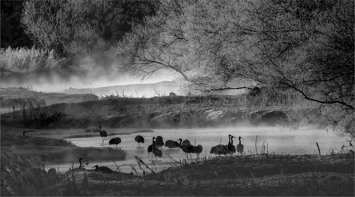 Cranes In Misty Morning